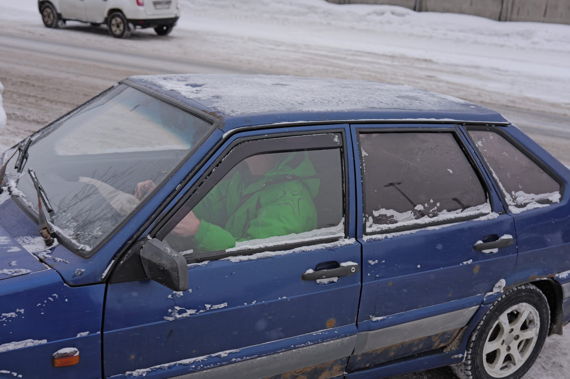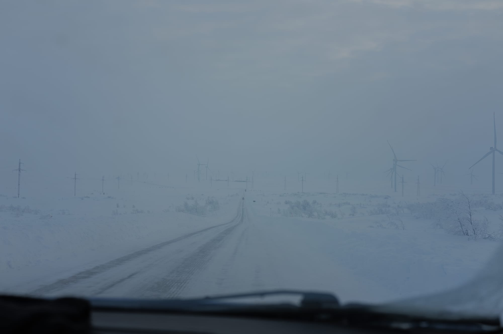 谁能想到,我们在国内找的包车代理租的车,结果来的车子和代理给的车辆信息完全对不上,结果就是让我们和包车小哥在户外等了半个多小时。小哥开的是一辆蓝色雷诺小汽车,小到我觉得我和他两个人可以搬起来。这辆车可是要一路向北,驾驶在冰天雪地之中的,现在回忆起来胆子也是真的大。确实也是不出所料,在回程路上,这辆小车先是遭遇斜坡打滑上不去,再经历反复十几次的倒车启动后才顺利前进,但这还只是开胃小菜,在回程后半段,直接来了一个原地270度打滑转体撞到路旁的雪堆,但小哥不做任何停顿,以迅雷不及掩耳之势挂上2档顺势起步,仿佛一切都没发生过。事后我们三人讨论时觉得其实当下异常镇定,现在越想越后怕,万一道路两旁没有积雪怎么办?对向来车怎么办?这都是塌天大祸!最终这辆小蓝车的右前方受损,这可以算是一场不大不小的车祸了。人生首次。