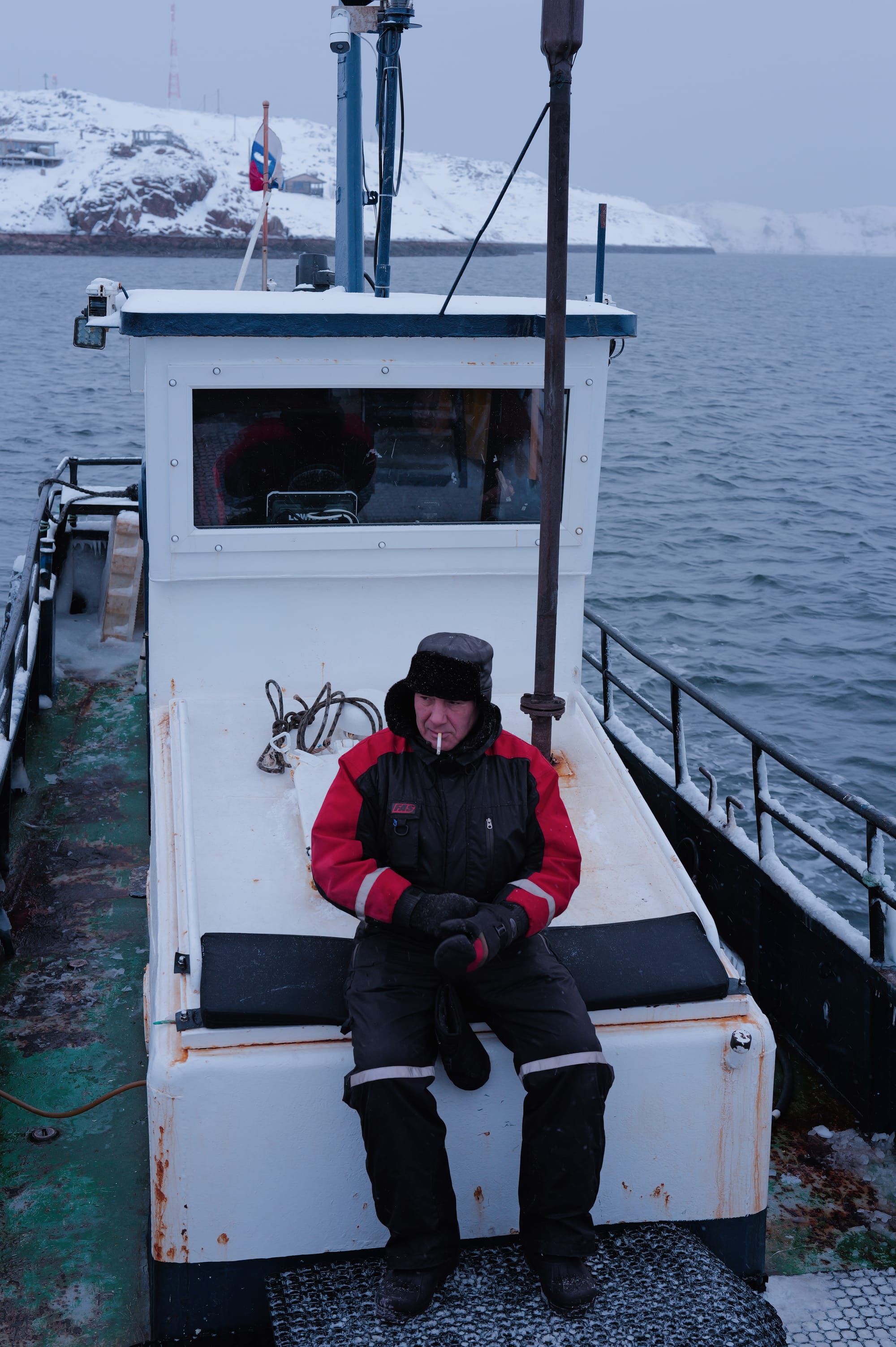 说回追鲸,其实也是一个非常惊险的过程,一共在船上行驶1.5小时,结果是啥都没看到,但是这可是北冰洋!时不时的飘点雪,纵使穿了厚厚的羊毛袜和雪地鞋,大脚拇指仍旧冻得梆硬,好在可以去船舱喝热茶,吃巧克力棒。可是床仓里一股柴油味,我呆了大概15分钟,剩下的时间都站在甲板上远眺,虽然也没啥可看的,但是会有一种莫名的敬畏,就是如果你掉下去,必死。死亡离你不过垂直高度2m左右,我保证这里掉下去绝无生存可能。鲸鱼我是没见到,倒是仿佛看到了世界尽头,安静的出奇但是却发出震耳欲聋的气息。世界失去了颜色。只有船舱内的一盏小黄灯亮着, 像是世界末日下最后的栖息地。所以在北冰洋上更多的是冻僵了的脑袋悟出来的抽象之意,怪不得俄罗斯盛产作家呢。