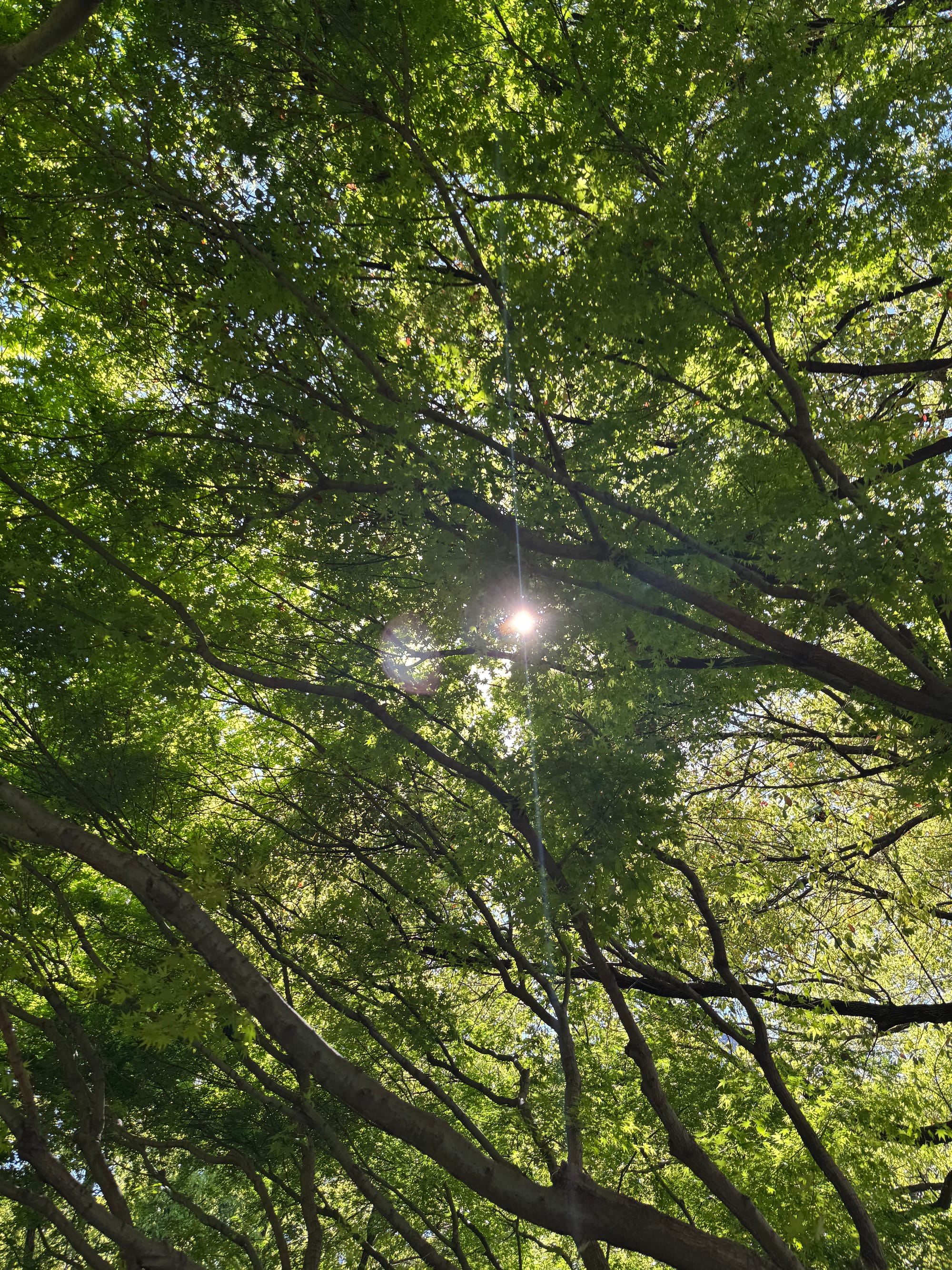 湿润的路面和透过梧桐树枝落在街道上的阳光